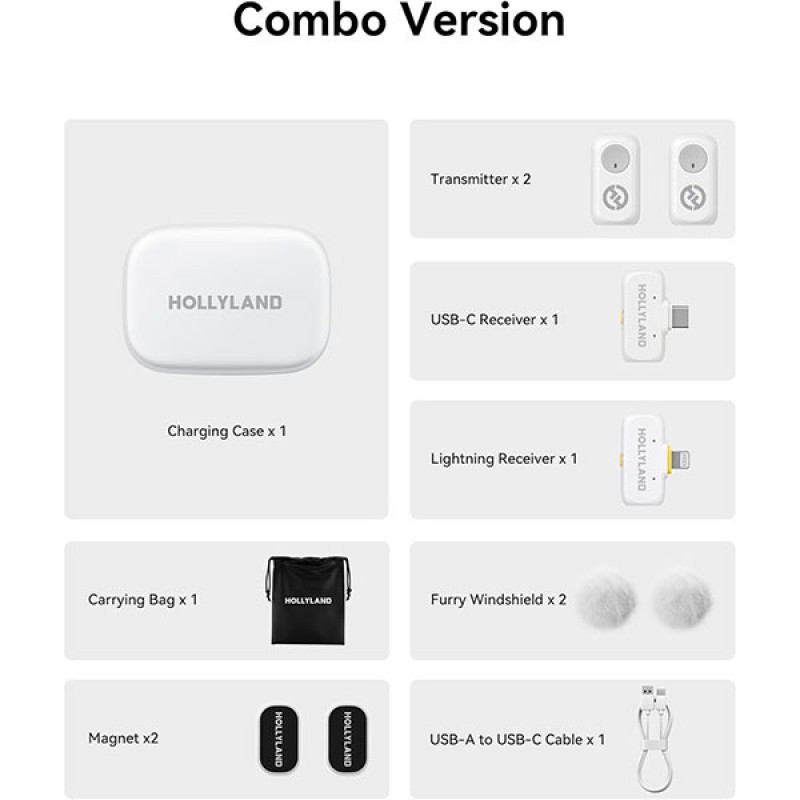 مايك لاسلكي ثنائي من HOLLYLAND، إصدار LARK A1 Duo Combo، مصمم لصنّاع المحتوى، التصوير، التعليم، والبودكاست. يحتوي على مرسلين ومستقبل بمنفذ Type-C أو Lightning حسب الإصدار. مناسب للاستخدام مع الهواتف الذكية والكاميرات وأجهزة الكمبيوتر. يتميز بجودة صوت نقية، ونظام إلغاء ضوضاء ذكي، وتصميم مدمج وسهل الحمل.