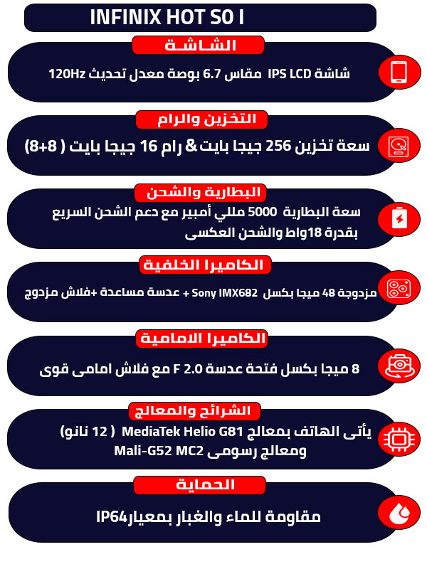 موبايل إنفينكس هوت i50 ثنائي الشريحة 256 جيجابايت 16جيجابايت 8+8 جيجابايت رام بشاشة 6.7 بوصة