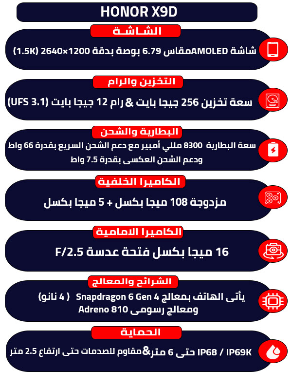 موبايل هونر x9d 5g ثنائى الشريحة سعة 256 جيجا بايت 12 جيجا رام شاشة 6.79 بوصة