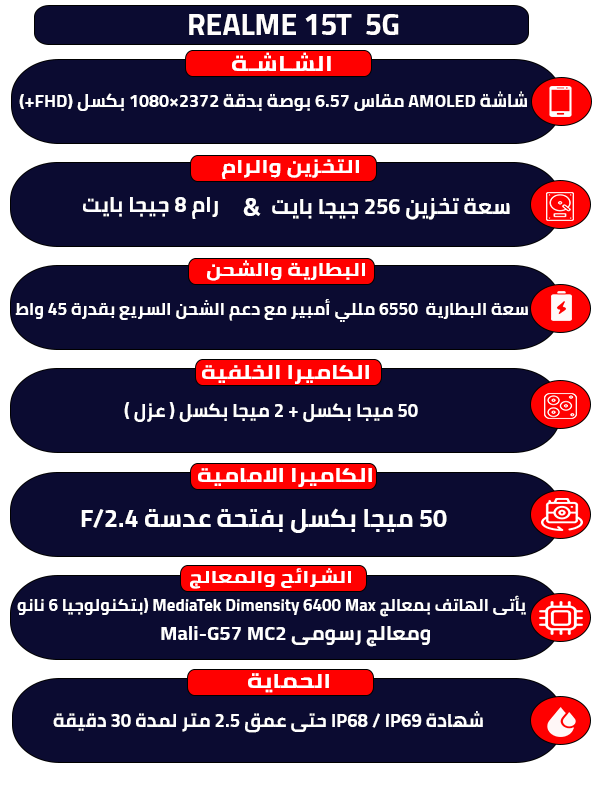 موبايل ريلمى 15 t ثنائى الشريحة 5g سعة 256 جيجا بايت 8 جيجا بايت رام 6.57