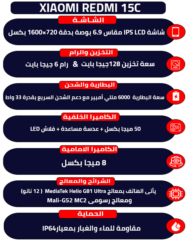 موبايل ريدمي 15 سي ثنائي الشريحة 128 جيجا بايت 6 جيجا رام 6.9