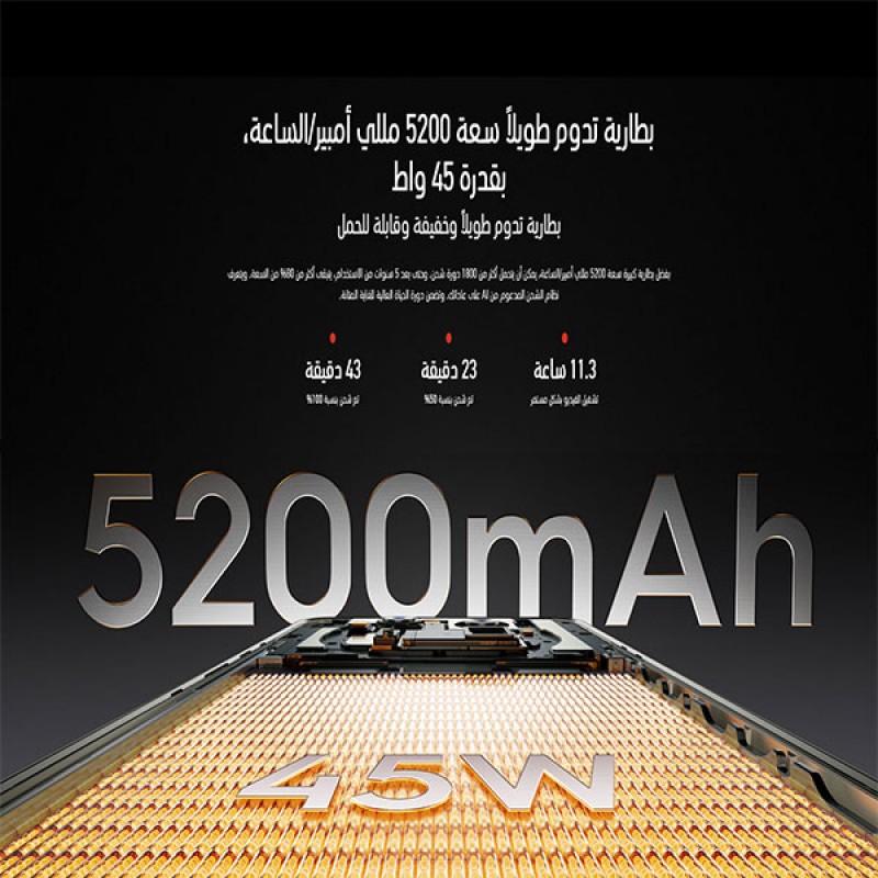 - بطارية كبيرة 5200 مللي أمبير مع شحن سريع 45 واط.