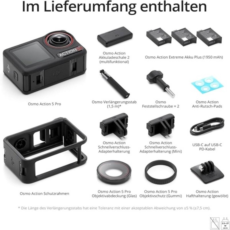 3 بطاريات، علبة شحن للبطاريات، عصا تمديد، دعم Quick-Release، إطار حماية، ملحقات تثبيت