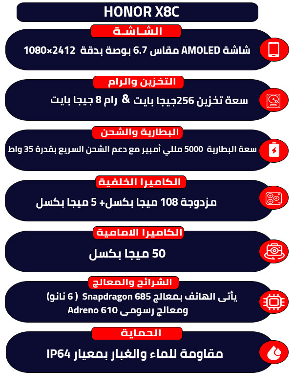 موبايل هونر x8c ثنائي الشريحة 256 جيجابايت 8 جيجابايت رام 6.7